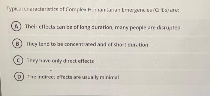 Some of the typical characteristics of CHEs are. Has a well-founded fear of persecution because of his or her race religion nationality membership in a particular social group or political opinion. 1Their effects can be of long duration many people are disrupted 2They tend to be concentrated and of short duration 3They have only direct effects 4The indirect effects are usually minimal.